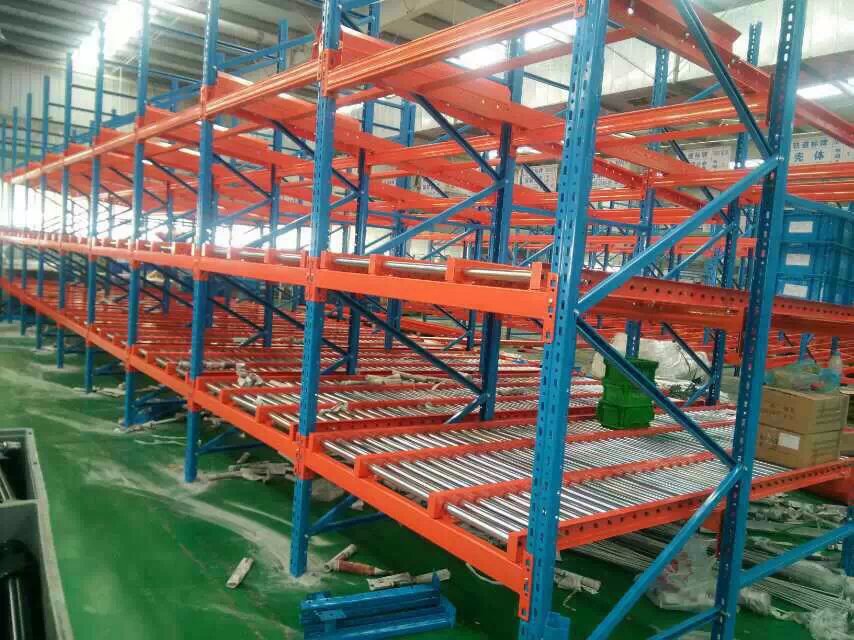 三、重力式貨架。其結構與橫梁式相似,只是在橫梁上安裝呈3-5°傾斜的滾筒式軌道,用叉車將貨物搬運至貨架進貨口,托盤利用自重自動滑行至另一端取貨口。由于坡道較低處的緩沖裝置與取貨分隔裝置設計,加深了設計、制造、安裝的難度,成本較高。比較適合資金雄厚,對貨物先進先出要求嚴格的企業(yè)。