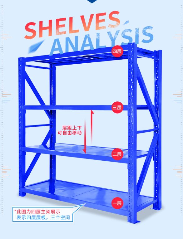 4、立柱設有每60mm調節孔距,可根據貨物高低任意調節。